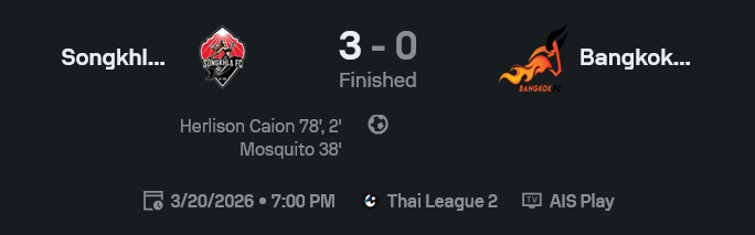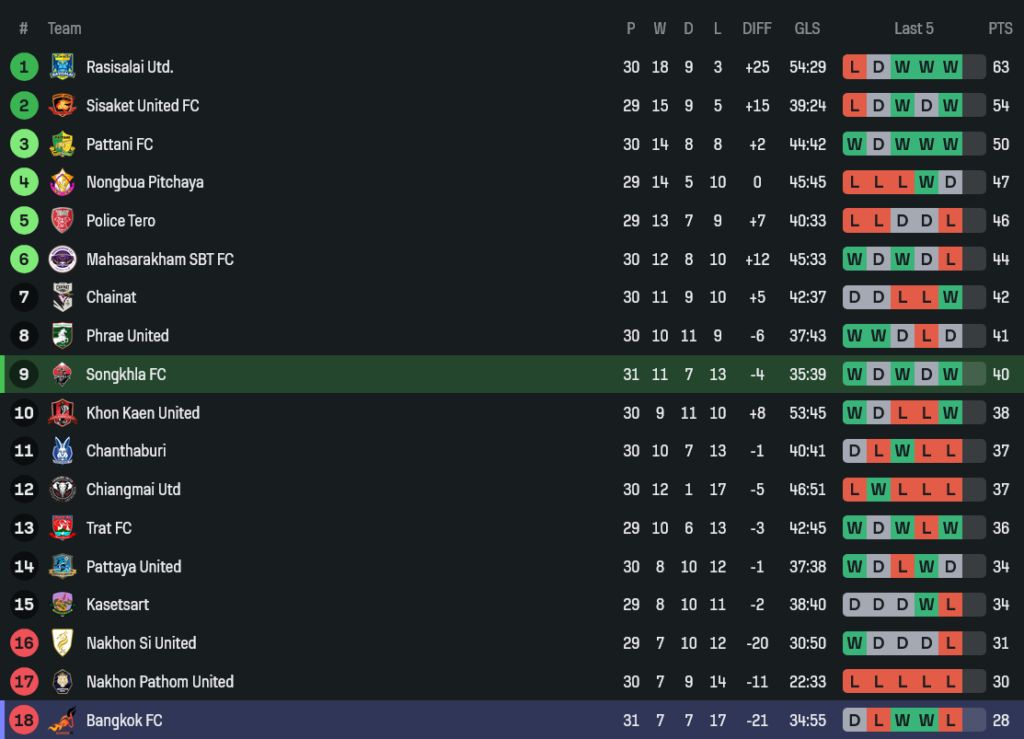 - สงขลาขยับไป 40 แต้ม ส่วนบางกอก เอฟซี ยังรั้งท้ายในโซนแดง