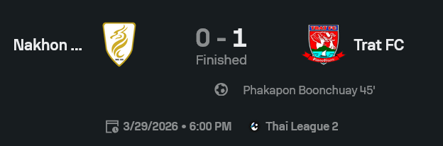 ศึก ไฮไลท์บอลวันนี้ จาก BYD SEAL 5 ลีกสอง นัดตกค้าง นครศรี ยูไนเต็ด แพ้คาบ้านให้ ตราด เอฟซี 0-1 จากประตูเดียวของ ฟากาปอน บุญช่วย นาที 45 ส่ง ผลบอลสด นัดนี้ให้ตราดเก็บสามแต้มสำคัญ ขยับขึ้นอันดับ 8 มี 42 คะแนน ส่วนนครศรียังจมโซนท้ายตารางแบบน่าหนักใจ