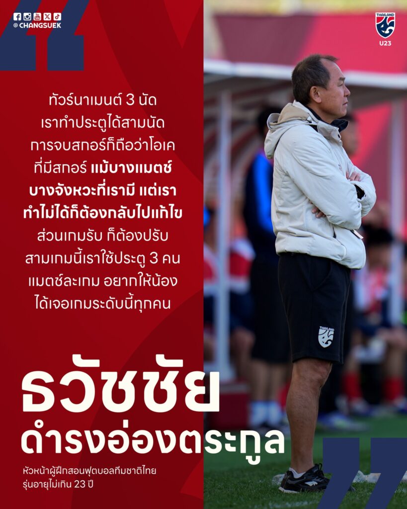 หลังจบเกม “โค้ชวัง” เปิดใจแบบตรงไปตรงมาว่า ทัวร์นาเมนต์นี้คือเวทีสำคัญที่ทำให้นักเตะไทย U23 ได้เจอกับเกมคุณภาพสูง และได้เรียนรู้จากคู่แข่งที่เล่นเร็ว หนัก และกดดันตลอดเวลา