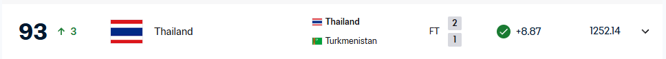 ก่อนการประกาศรอบล่าสุด ไทยมีคะแนนสะสมอยู่ที่ 1243.27 คะแนน แต่หลังจบภารกิจคัดเลือกและเก็บผลงานได้ตามเป้า คะแนนเพิ่มขึ้นอีก 8.87 แต้ม ทำให้ยอดรวมขยับเป็น 1252.14 คะแนน พร้อมทะยานขึ้น 3 อันดับสู่ที่ 93 ของโลก นอกจากนี้ยังยืนอยู่ในอันดับ 14 ของทวีปเอเชีย ซึ่งถือเป็นตำแหน่งที่มีความหมายไม่น้อยต่อภาพรวมของฟุตบอลไทยในระยะต่อไป