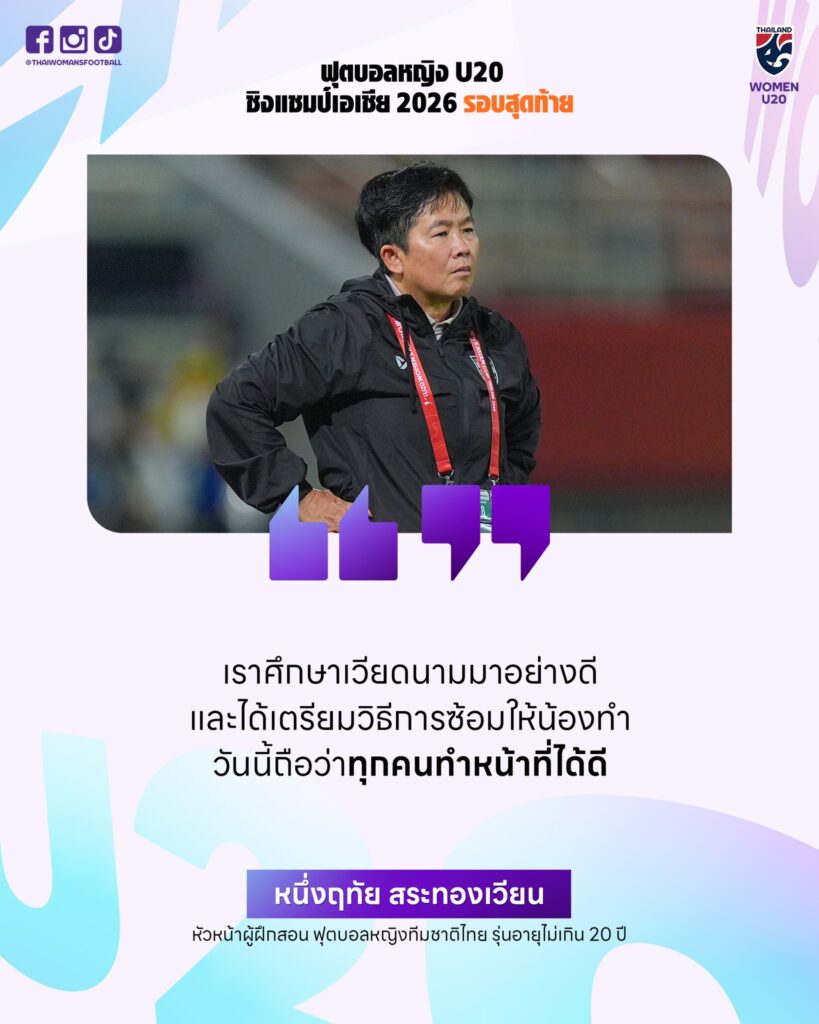 หนึ่งฤทัย สระทองเวียน กุนซือทัพสาวไทย U20 มองว่าลูกทีมเริ่มนิ่งและเข้าใจเกมในรอบสุดท้ายมากขึ้น โดยเฉพาะการเจอกับเวียดนามที่ทุกคนค่อนข้างมั่นใจ เพราะมีข้อมูลและการเตรียมตัวที่ชัดเจนจากการซ้อมและการศึกษาคู่แข่งมาอย่างละเอียด จนสามารถถ่ายทอดสิ่งที่ซ้อมออกมาได้อย่างมีประสิทธิภาพในสนาม.