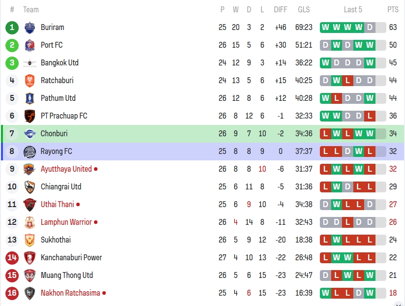 ชัยชนะนัดนี้ทำให้ชลบุรีลงเล่น 26 นัด มี 34 คะแนน ขยับทรงให้ดูมั่นคงขึ้นในอันดับ 7 ส่วนระยองลงเล่น 25 นัด มี 32 คะแนน อยู่อันดับ 8 ช่องว่างระหว่างสองทีมเลยยิ่งชัดว่าเกมนี้ไม่ใช่แค่สามแต้ม แต่มันคือการตบกันตรงๆ บนตารางคะแนนด้วย