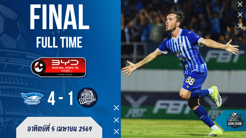 เกม ไทยลีก 1 วันที่ 5 เมษายน 2569 จบลงแบบคนดูชัด คนแพ้ช้ำ เมื่อ ชลบุรี เอฟซี เปิดบ้านไล่ถล่ม ระยอง เอฟซี 4-1 ทั้งที่เริ่มเกมมาโดนก่อนจากจุดโทษของ สเตนีอู ฌูนีโยร์ แต่พอเครื่องติดเมื่อไร ฉลามชลเล่นเหมือนคนโดนเหยียบหาง ไล่ขึง ไล่ยิง ไล่บด จนระยองจากที่นำก่อน กลายเป็นโดนรัวคืนแบบตั้งตัวแทบไม่ทัน เกมนี้จุดเปลี่ยนชัดมากคือครึ่งหลังที่ชลบุรีเล่นเร็วกว่า คมกว่า และเอาจริงกว่าแบบไม่ต้องพูดเยอะ