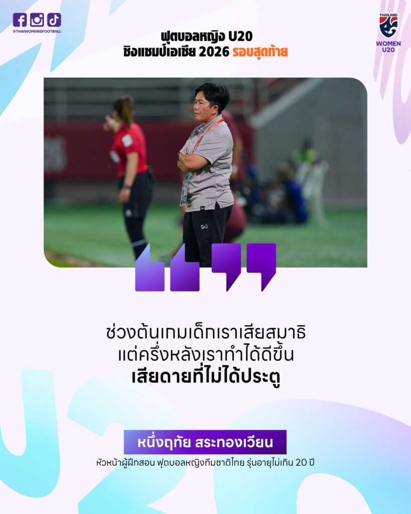 อย่างไรก็ตาม เธอไม่ได้โยนความผิดไปที่นักเตะคนใดคนหนึ่ง โดยเฉพาะจังหวะเสียประตูที่ถูกจับตามองหลังเกม เพราะโค้ชหนึ่งยืนยันชัดว่า “ส่วนข้อผิดพลาดของประตูไม่ได้โทษน้อง เพราะฟุตบอลเล่นเป็นทีม ต้องรับผิดชอบด้วยกัน” คำพูดนี้สะท้อนชัดเจนว่าทีมชุดนี้ยังยืนอยู่บนแนวคิดร่วมรับร่วมสู้ และไม่ปล่อยให้ความผิดพลาดของใครคนหนึ่งมาทำลายบรรยากาศทั้งทีม