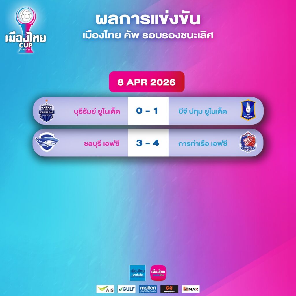 การแข่งขันฟุตบอลถ้วย เมืองไทย คัพ ฤดูกาล 2025/26 รอบรองชนะเลิศ เมื่อวันพุธที่ 8 เมษายน 2569 ปิดฉากลงแบบเข้มข้นสมศักดิ์ศรีบอลถ้วย โดยได้ 2 ทีมสุดท้ายที่ผ่านเข้าสู่รอบชิงชนะเลิศเป็นที่เรียบร้อย หลังทั้ง บีจี ปทุม ยูไนเต็ด และ การท่าเรือ เอฟซี ต่างงัดฟอร์มเด็ดในเกมสำคัญและคว้าตั๋วไปลุ้นแชมป์ได้สำเร็จ