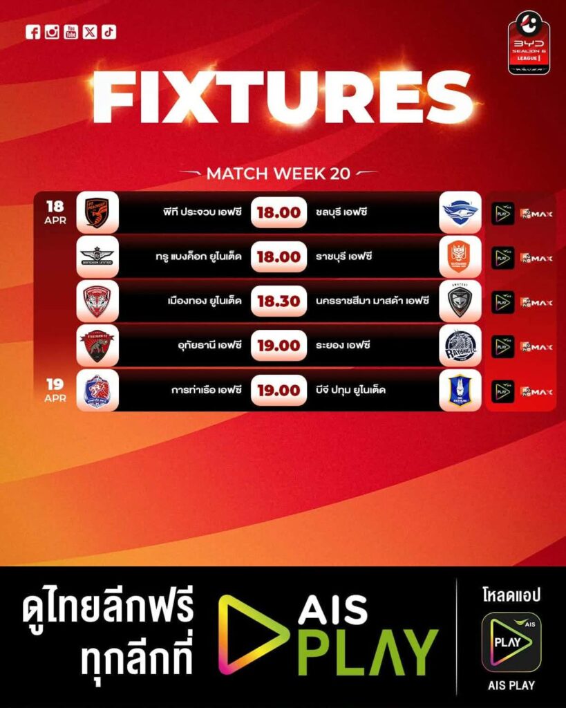 โปรแกรมแข่งขันวันเสาร์ที่ 18 เมษายน 2026