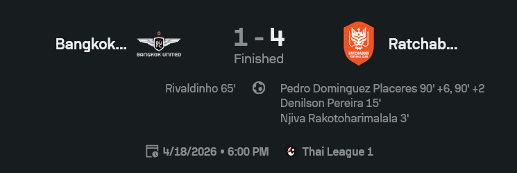 ศึก BYD SEALION 6 ลีกหนึ่ง เกมนี้หลายคนคิดว่าแบงค็อกน่าจะคุมอยู่ แต่พอเตะจริงกลับเป็นราชบุรีที่เล่นได้เจ็บกว่า ขึ้นนำเร็วตั้งแต่นาที 3 จาก เอ็นจีวา ราโคโตฮารีมาลาลา ก่อนเดนิลสันจะกดเพิ่มนาที 15 จบครึ่งแรกเจ้าถิ่นตาม 0-2 ครึ่งหลังราชบุรีเหลือ 10 คนจากใบแดงของอดิศร พรหมรักษ์ แต่แบงค็อกไล่มาได้แค่ลูกเดียวจากริวัลดินโญ่ แล้วโดนตานาซัดสองเม็ดช่วงท้าย ปิดเกมให้ราชบุรีบุกถล่ม 4-1 แบบช็อกแฟนเจ้าบ้าน
