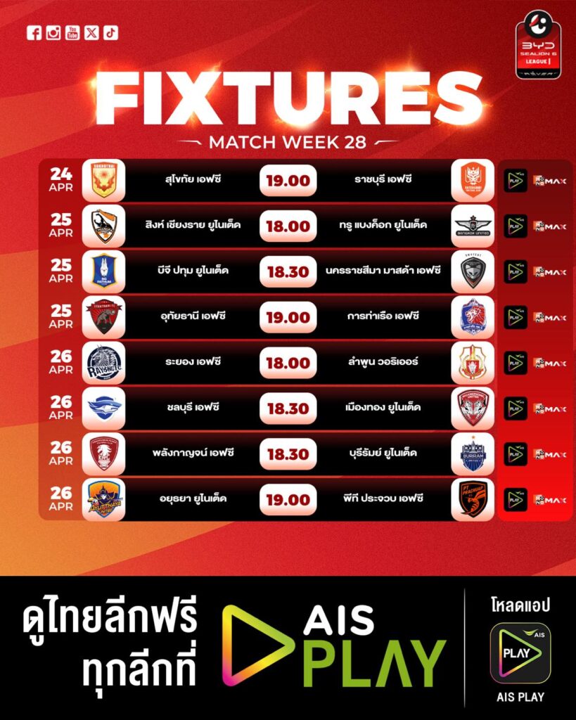 แฟนบอลสามารถติดตาม ถ่ายทอดสด ครบทุกคู่ได้ทาง AIS PLAY และ Monomax ซึ่งถือเป็นสองแพลตฟอร์มหลักที่พร้อมเสิร์ฟความมันของเกมลีกให้ชมกันแบบต่อเนื่องตลอดสุดสัปดาห์นี้
