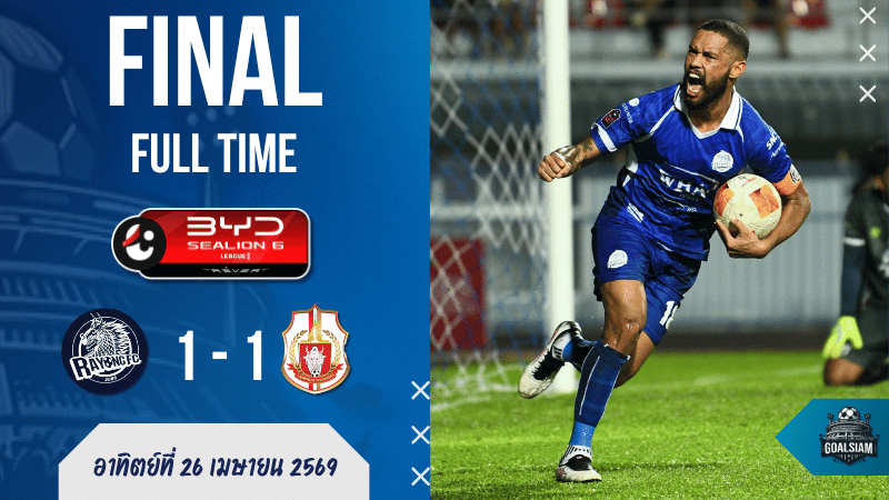 ศึก ผลบอลสด ไทยลีก 1 วันที่ 26 เมษายน 2569 ระยอง เอฟซี เปิดบ้านเสมอ ลำพูน วอริเออร์ 1-1 เกมนี้ลำพูนบุกนำก่อนจาก วิลเลี่ยน โมต้า นาที 35 แต่เจ้าถิ่นไม่ยอมตายง่าย ๆ ได้ สเตนีอู ฌูนีโยร์ รับบทพระเอกซัดจุดโทษนาที 79 แบ่งแต้มกันไปแบบเหนื่อยทั้งคู่ เกมนี้พูดง่าย ๆ คือ ระยองยิงเยอะกว่า ครองบอลมากกว่า แต่จบสกอร์ยังเหมือนคนถือมีดเข้าครัวแล้วลืมเปิดแก๊ส ส่วนลำพูนก็มาแบบเน้นเขี้ยว รอจังหวะสวนแล้วเกือบขโมยสามแต้มกลับบ้าน