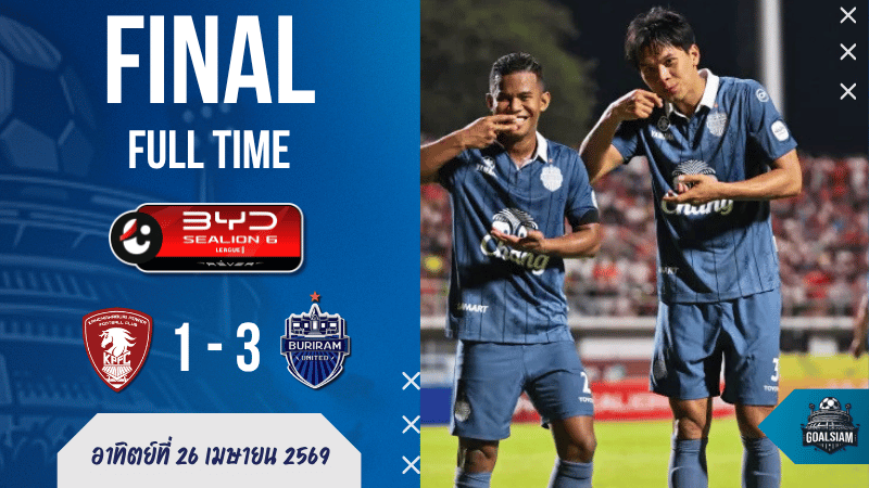 ผลบอลสด ไทยลีก 1 วันที่ 26 เมษายน 2569 พลังกาญจน์ เอฟซี เปิดบ้านพ่าย บุรีรัมย์ ยูไนเต็ด 1-3 ทั้งที่ออกนำก่อนจาก ชยพิพัฒน์ สุพรรณเภสัช นาที 23 แต่ครึ่งหลัง “ปราสาทสายฟ้า” กลับมาแบบใส่เกียร์ห้า ยิงคืนรวดเดียวสามเม็ดจาก กีแยร์เม บิสโซลี, พรรษา เหมวิบูลย์ และ ศศลักษณ์ ไหประโคน เกมนี้เหมือนหนังคนละม้วน ครึ่งแรกเจ้าบ้านได้เฮ ครึ่งหลังบุรีรัมย์บอกขอคืนทั้งต้นทั้งดอก