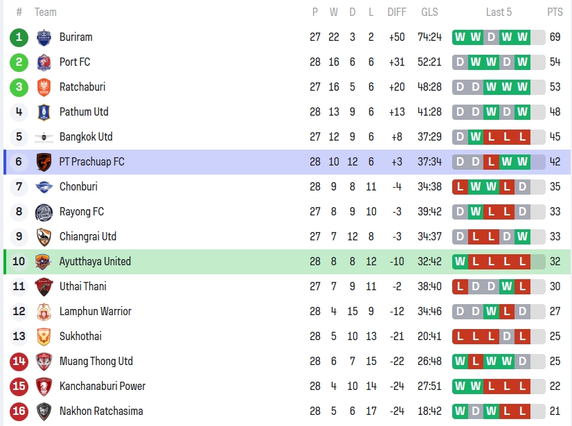 ส่วนอยุธยา ยูไนเต็ด แข่ง 28 นัด ชนะ 8 เสมอ 8 แพ้ 12 มี 32 คะแนน อยู่ที่ 10 ของตาราง ฟอร์ม 5 นัดหลังสุดเป็น W-L-L-L-L อันนี้ต้องบอกตรงๆ ว่าน่าเป็นห่วง จากทีมที่เหมือนจะตั้งหลักได้ กลายเป็นโดนลากกลับเข้าโหมดลุ้นเหนื่อยอีกครั้ง เกมนี้นำก่อนแต่แพ้ นี่คือแผลใจแบบแฟนบอลจำแม่นยิ่งกว่ารหัสไวไฟบ้านตัวเอง