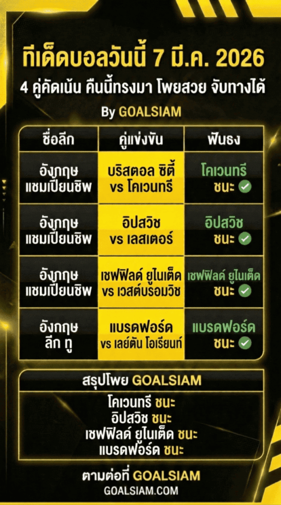 GOALSIAM สรุปให้ คืนนี้ถ้าจะเอาให้คมๆ ไปทาง ทีเด็ดบอลเต็ง ก็จับ โคเวนทรี, อิปสวิช, เชฟฟิลด์ ยูไนเต็ด, แบรดฟอร์ด ไว้ก่อน ส่วนสายชอบลุ้นยาวจัดเป็น ทีเด็ดบอลชุด หรือทำเป็น ทีเด็ดบอลสเต็ป ก็หยิบทั้ง 4 คู่ไปเรียงได้เลย นี่แหละ ทีเด็ดบอลคืนนี้ 4 คู่ ที่ทรงบอลมันพาไปทางเดียวกัน ขออย่างเดียวอย่าใจอ่อนตอนราคาขยับ อย่าเห็นใครพิมพ์สวนแล้วมือสั่น บอลมันเตะในสนาม ไม่ได้เตะในคอมเมนต์
