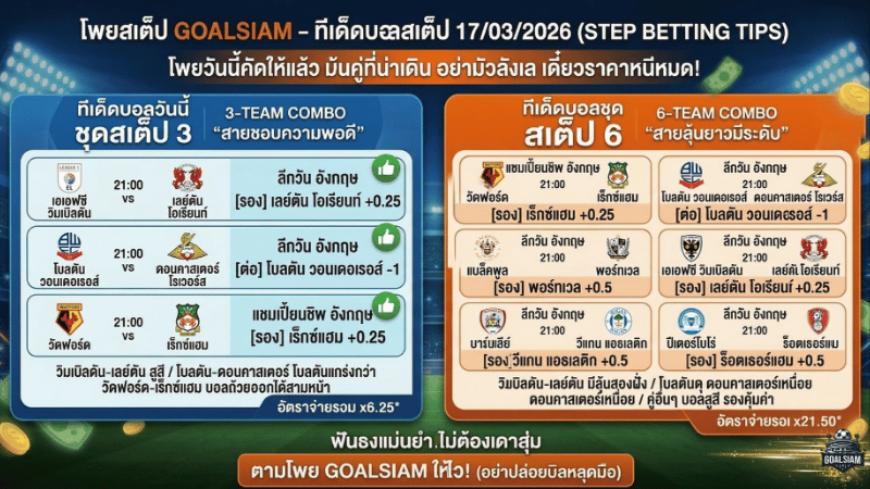 GOALSIAM มองว่าชุดนี้เป็นทรงบอลที่พอจับมัดรวมแล้วน่าเล่นกว่าพวกต่อแพงแบบหล่อแต่ล้มง่าย เลย์ตัน โอเรียนท์ กับ เร็กซ์แฮม เป็นฝั่งรองที่มีมุมให้ลุ้นกินครึ่งกินเต็ม ส่วนโบลตันต่อหนึ่งลูกก็จริง แต่เจอทรงคู่แข่งที่มีแผลให้เจาะ ถ้าจะจัด ทีเด็ดบอลสเต็ป แบบไม่เยิ่นเย้อ ชุดนี้ถือว่าเข้ามือและพอให้ตามได้แบบไม่ต้องคิดเยอะ