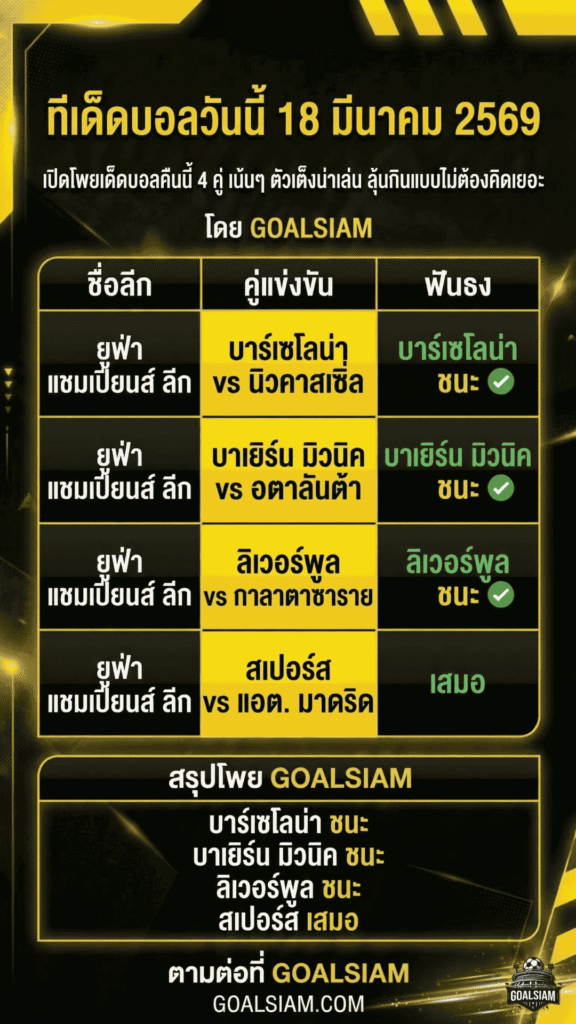 ใครกำลังหา ทีเด็ดบอลวันนี้ ที่อ่านแล้วเข้าใจง่ายและหยิบไปใช้งานต่อได้ทันที วิเคราะห์บอล GOALSIAM จัดให้แบบไม่อ้อมค้อม ทั้ง ทีเด็ดบอลคืนนี้ 4 คู่ และตัวเลือกแน่นๆ สำหรับสายตามโพยจริง คืนไหนบอลเดือด คืนไหนราคาน่าเสี่ยง เข้ามาเช็กกันก่อนวางบิล จะเล่นสั้นหรือจัด ทีเด็ดบอลเต็ง ก็ต้องมีข้อมูลที่พอให้ตัดสินใจ ไม่ใช่หลับหูหลับตาตามจนบิลปลิวแล้วมานั่งเสียดายทีหลัง