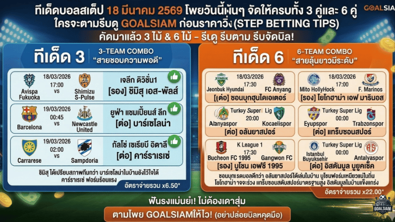 ทีเด็ดบอลสเต็ป 6 ประจำวันที่ 18/03/2026