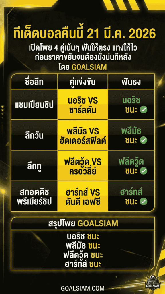 ใครกำลังหา ทีเด็ดบอลคืนนี้ 4 คู่ ที่คัดมาแล้วแบบอ่านง่าย ใช้งานได้จริง และมีมุมให้ตามแบบไม่ต้องฝืนความรู้สึก GOALSIAM ยังพร้อมเสิร์ฟทุกวัน ทั้งมุมบอลน่าเล่นและ ทีเด็ดบอลเต็ง ที่เอาไปต่อยอดโพยได้ทันที อย่ารอให้บอลจบแล้วค่อยมานั่งเสียดาย เปิดอ่าน ทีเด็ดบอลวันนี้ กับ วิเคราะห์บอล GOALSIAM ให้ไว แล้วเลือกจิ้มคู่ที่ใช่ก่อนราคาจะไหลหนีมือ