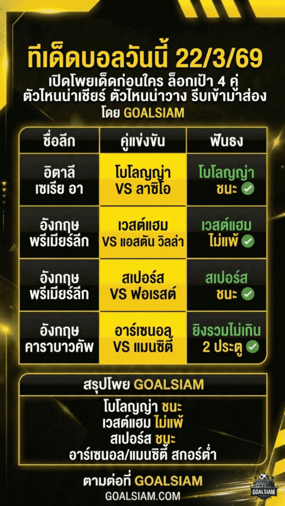 ใครกำลังหา ทีเด็ดบอลวันนี้ ที่อ่านแล้วเอาไปวางโพยต่อได้จริง ต้องตาม วิเคราะห์บอล GOALSIAM ให้ดี เพราะเราคัดให้แบบเน้นๆ ตรงจุด เล่นได้จริง คืนนี้ถ้าจะจัด ทีเด็ดบอลคืนนี้ 4 คู่ หรือหา ทีเด็ดบอลเต็ง ไปยืนพื้น อย่าปล่อยให้โพยของคุณขาดชื่อ GOALSIAM เพราะบางคืนบิลจะรอดหรือร่วง มันเริ่มตั้งแต่เลือกตามใครนี่แหละ