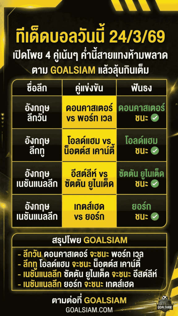 คืนวันอังคารที่ 24 มีนาคม 2569 บอลลีกล่างอังกฤษมีมุมให้เล่นอยู่พอตัว GOALSIAM คัดมาแล้ว 4 คู่ที่ทรงดี ฟอร์มชัด และน่าตามมากกว่าสวน ใครกำลังหา ทีเด็ดบอลวันนี้ แบบอ่านจบแล้วหยิบไปใช้ต่อได้เลย โพยนี้ตอบโจทย์