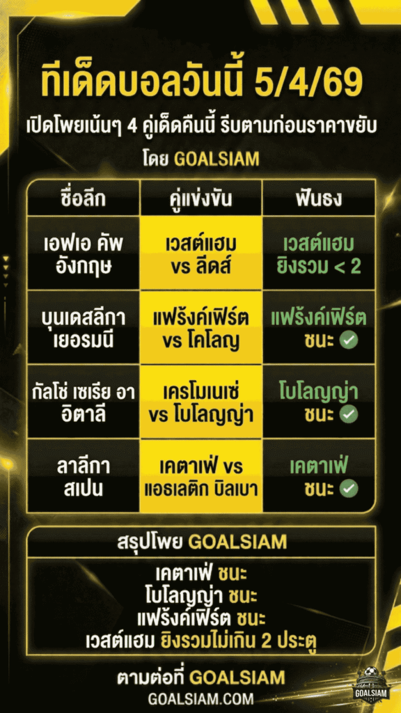 คืนนี้บอลมีให้เล่นหลายลีก แต่จะหยิบมั่วก็มีสิทธิ์น้ำตาซึมตอนเช็กสลิป GOALSIAM เลยคัดให้เฉพาะ 4 คู่ที่ทรงมา ฟอร์มมี เหตุผลชัด และพอให้ตามได้แบบไม่ต้องหลับตาจิ้ม เพราะบางคู่ชื่อชั้นดูใหญ่ก็จริง แต่ฟอร์มในสนามดันเล่นเหมือนลืมพกความมั่นใจมาเอง ฉะนั้นใครกำลังหา ทีเด็ดบอลวันนี้ เอาไว้ต่อยอดโพย คืนนี้มีตัวให้ลุ้นแบบพอจับทางได้