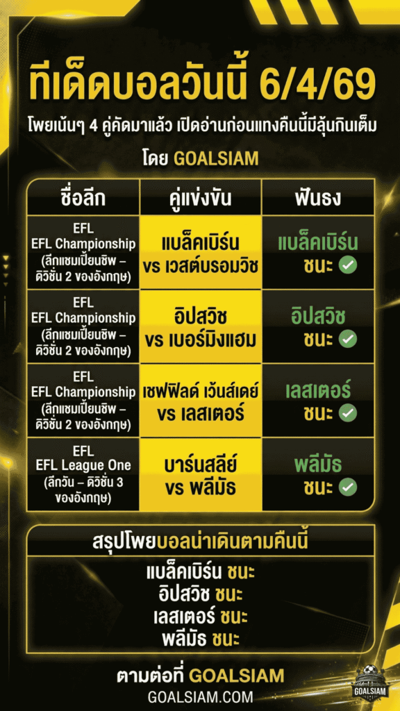 คืนนี้บอลอังกฤษรองๆ นี่แหละของจริง เพราะบางทีมกำลังหนีตาย บางทีมกำลังล่าแต้มเลื่อนชั้น และพอเกมมันมีแรงกดดัน ราคามันก็เริ่มพูดความจริงมากขึ้น GOALSIAM เลยคัด ทีเด็ดบอลวันนี้ มาให้แบบเน้นๆ 4 คู่จากแชมเปี้ยนชิพกับลีก วัน ที่มองแล้วมีมุมให้ตามน้ำได้ชัดกว่าเดาไปเรื่อย งานนี้ไม่ต้องมองเยอะ เอาเฉพาะคู่ที่ทรงดี แรงจูงใจมาเต็ม และคู่แข่งมีรอยร้าวให้เจาะ