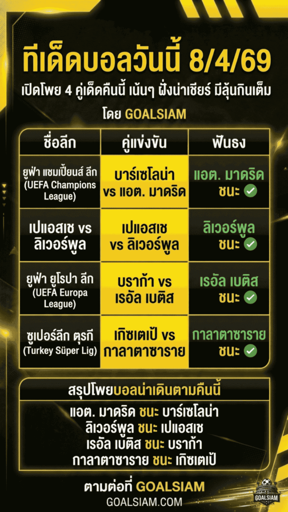 คืนนี้บอลยุโรปกลับมาทำงานอีกคืน และต้องบอกตามตรงว่าโปรแกรมแบบนี้ต่อให้ใจแข็งแค่ไหนก็มีสะดุ้ง เพราะแต่ละคู่ชื่อชั้นมันบีบให้คนดูต้องเลือกข้างเร็วเกินเหตุ แต่ GOALSIAM มองว่าเกมที่น่าเล่นจริงไม่ใช่คู่ที่คนแห่ตามกันเสียงดังที่สุดเสมอไป บางเกมราคายกเจ้าบ้านจนเหมือนลืมไปว่าอีกฝั่งไม่ได้มาจากงานวัด ฉะนั้นโพยนี้คัดมาแบบเน้นใช้งานได้จริง เอาให้พอเป็นทางสำหรับคนที่กำลังหา ทีเด็ดบอลวันนี้ ไปต่อยอดก่อนวางบิล