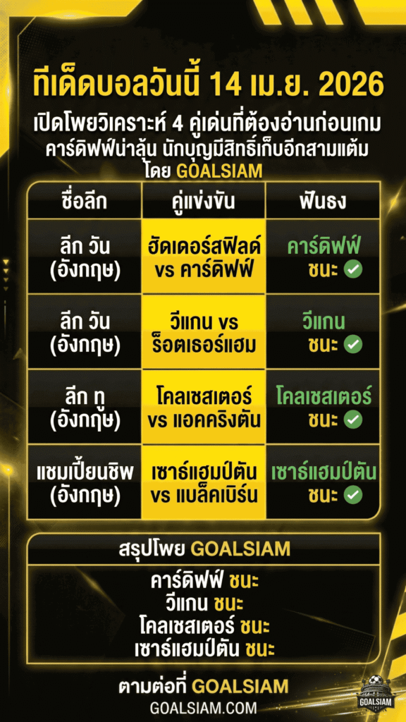 ถ้ามองจากฟอร์มและสถานการณ์บนตาราง คาร์ดิฟฟ์กับเซาธ์แฮมป์ตันคือสองทีมที่ดูเด่นที่สุดในคืนนี้ ส่วนวีแกนกับโคลเชสเตอร์ก็เป็นฝั่งที่ได้เปรียบจากฟอร์มคู่แข่งที่ดรอปลงชัดเจน ใครที่กำลังมองหาเกมเด่นหรือคู่ที่น่าติดตามต่อ ชุดนี้ถือว่าอ่านง่ายและมีน้ำหนักพอสมควร โดยเฉพาะในมุมของ ทีเด็ดบอลเต็ง