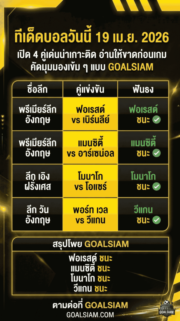 คืนนี้บอลมีทั้งคู่ใหญ่ คู่กดดัน และคู่ที่ดูเผิน ๆ เหมือนไม่มีอะไร แต่เอาเข้าจริงดันซ่อนจุดชี้ขาดไว้เต็มเกม โดยเฉพาะศึกที่หลายคนจับตาอย่าง แมนซิตี้ พบ อาร์เซน่อล นี่ไม่ใช่แมตช์ดูเพลิน ๆ แล้วค่อยเดาเอาหน้างาน เพราะถ้าอ่านรูปเกมไม่ออก มีสิทธิ์มองผิดตั้งแต่นาทีแรก GOALSIAM เลยคัดมาให้เน้น ๆ กับ ทีเด็ดบอลคืนนี้ 4 คู่ จากเกมที่มีทรง มีน้ำหนัก และมีเหตุผลพอให้ตามบทวิเคราะห์กันแบบจริงจัง