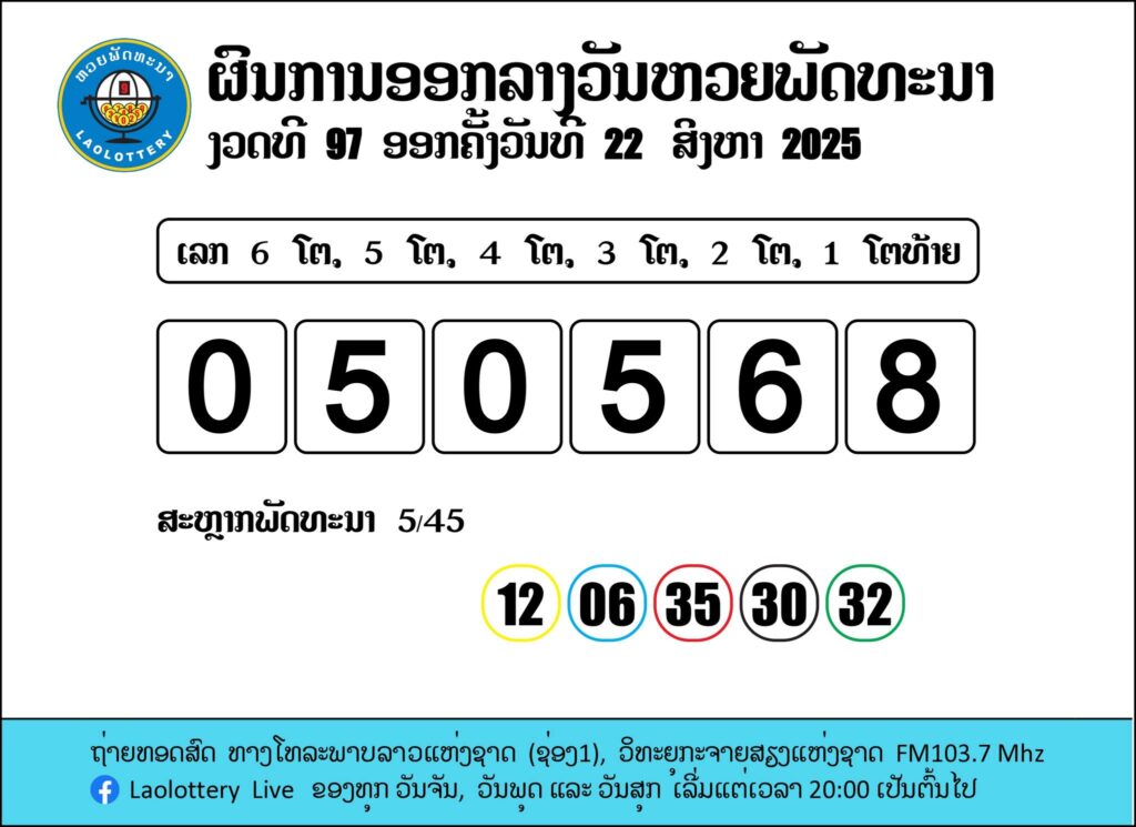 📌 ผลรางวัลหวยลาววันนี้ 22 สิงหาคม 2568 (ลาวพัฒนา)