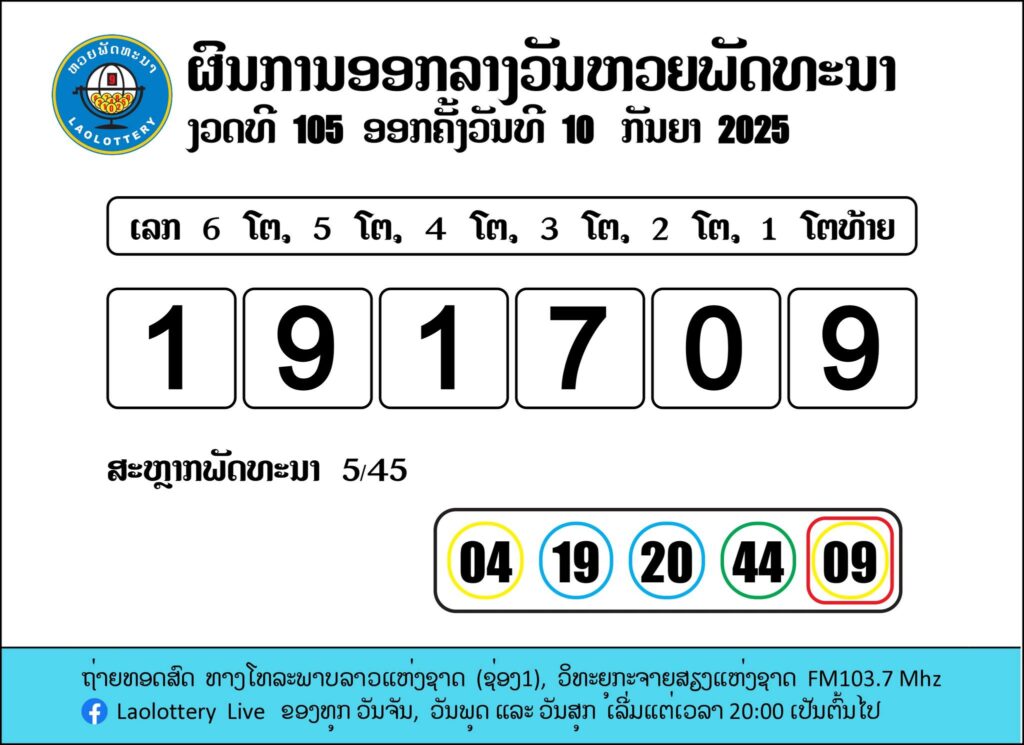 📌 ผลรางวัลหวยลาววันนี้ 10 กันยายน 2568 (ลาวพัฒนา)