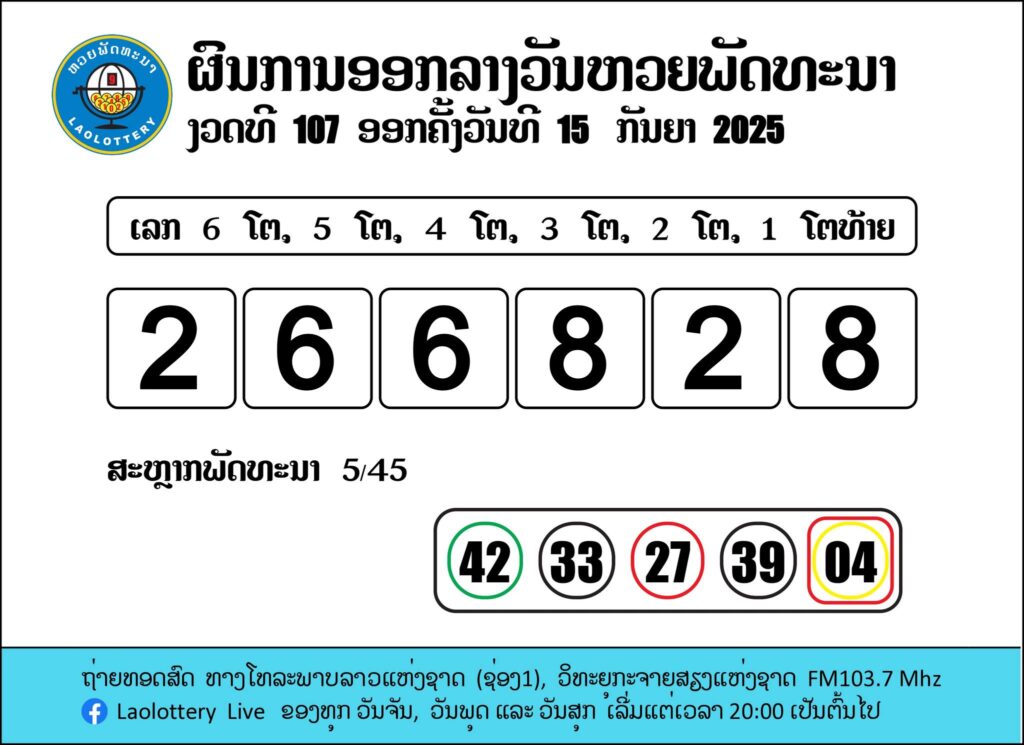 📌 ผลรางวัลหวยลาววันนี้ 15 กันยายน 2568 (ลาวพัฒนา)
