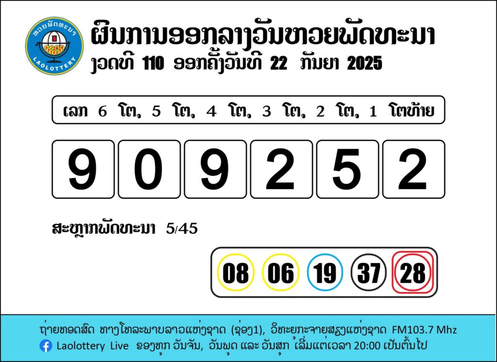 📌 ผลรางวัลหวยลาววันนี้ 22 กันยายน 2568 (ลาวพัฒนา)