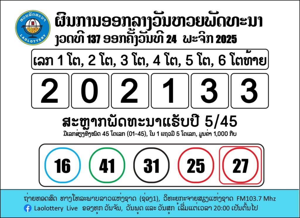 📌 ผลรางวัลหวยลาววันนี้ 24 พฤศจิกายน 2568 (ลาวพัฒนา)