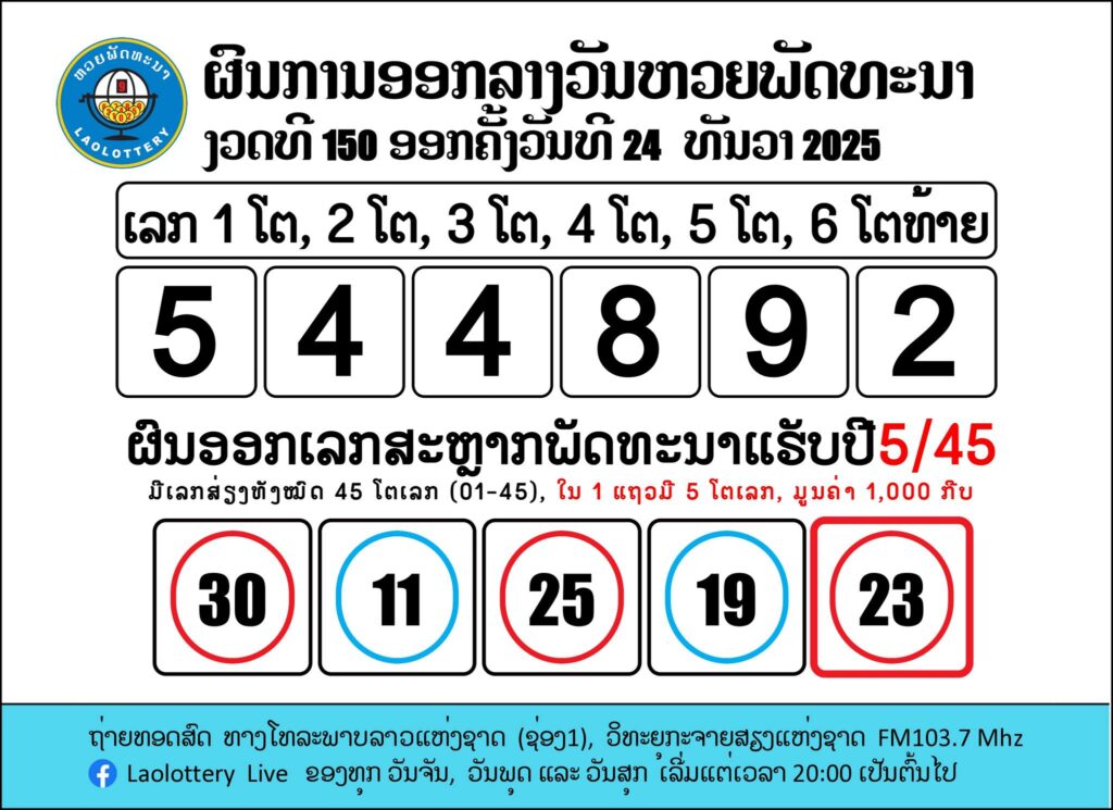 📌 ผลรางวัลหวยลาววันนี้ 24 ธันวาคม 2568 (ลาวพัฒนา)