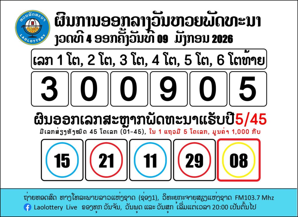 📌 ผลรางวัลหวยลาววันนี้ 9 มกราคม 2569 (ลาวพัฒนา)