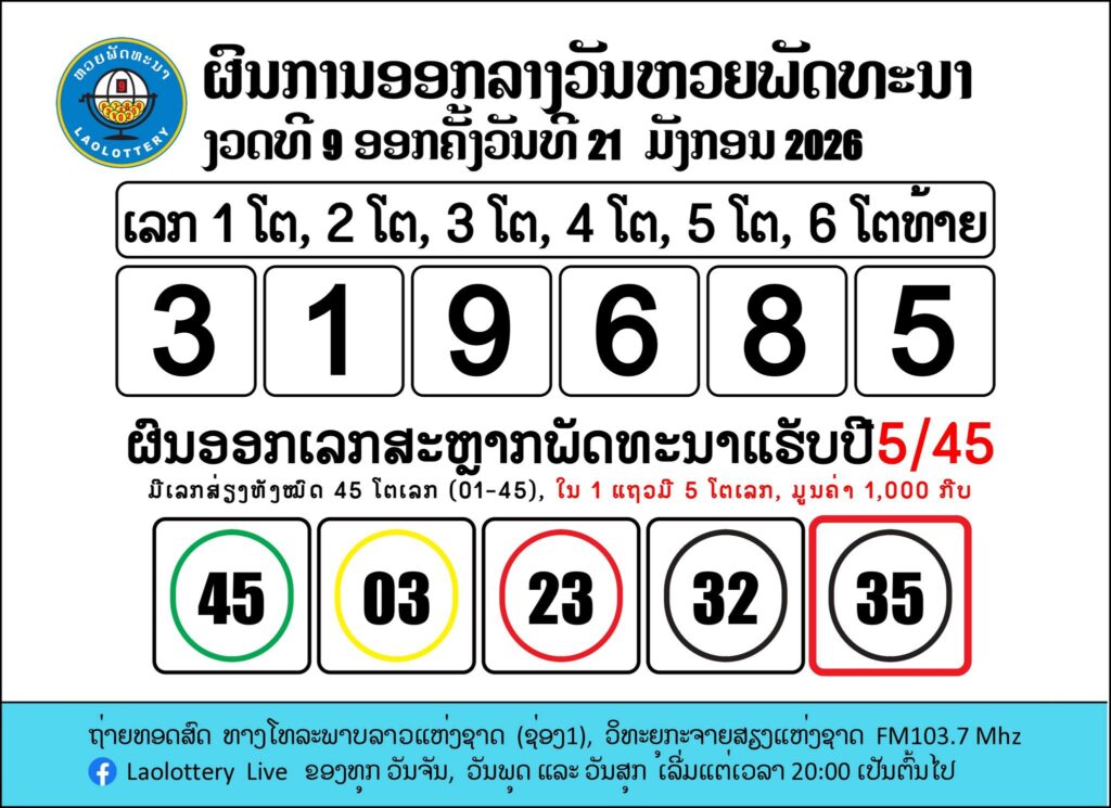 📌 ผลรางวัลหวยลาววันนี้ 21 มกราคม 2569 (ลาวพัฒนา)