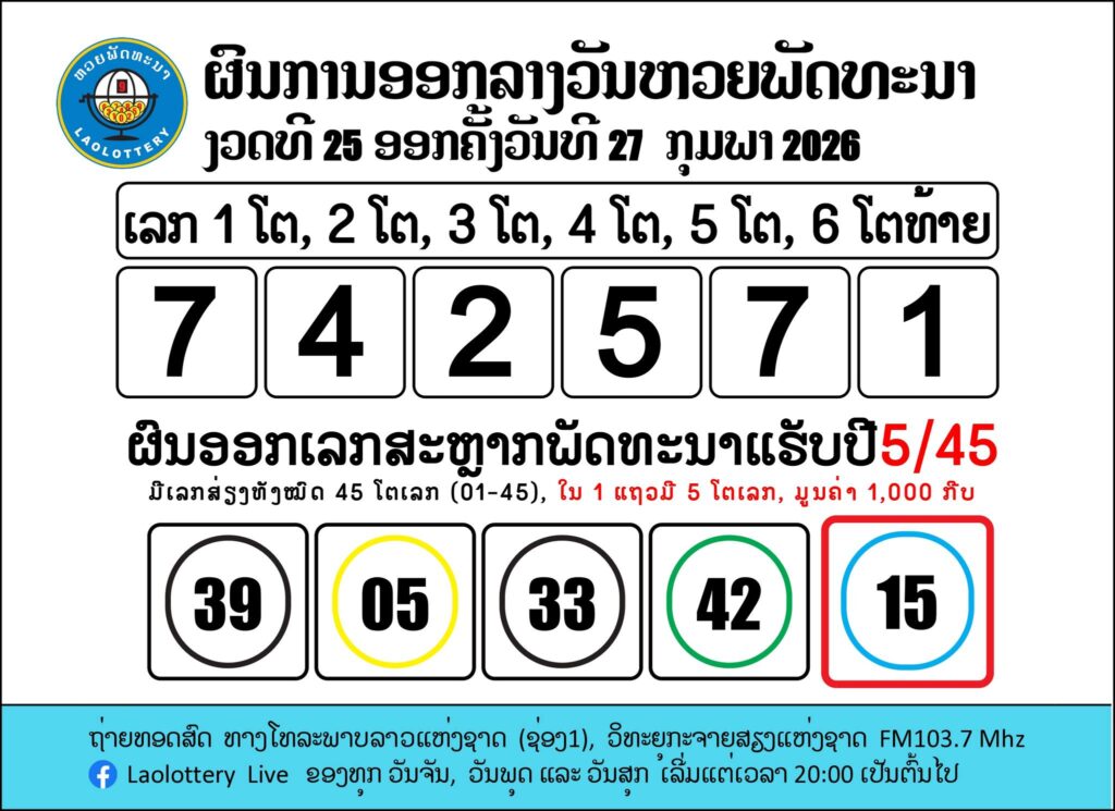📌 ผลรางวัลหวยลาววันนี้ 27 กุมภาพันธ์ 2569 (ลาวพัฒนา)