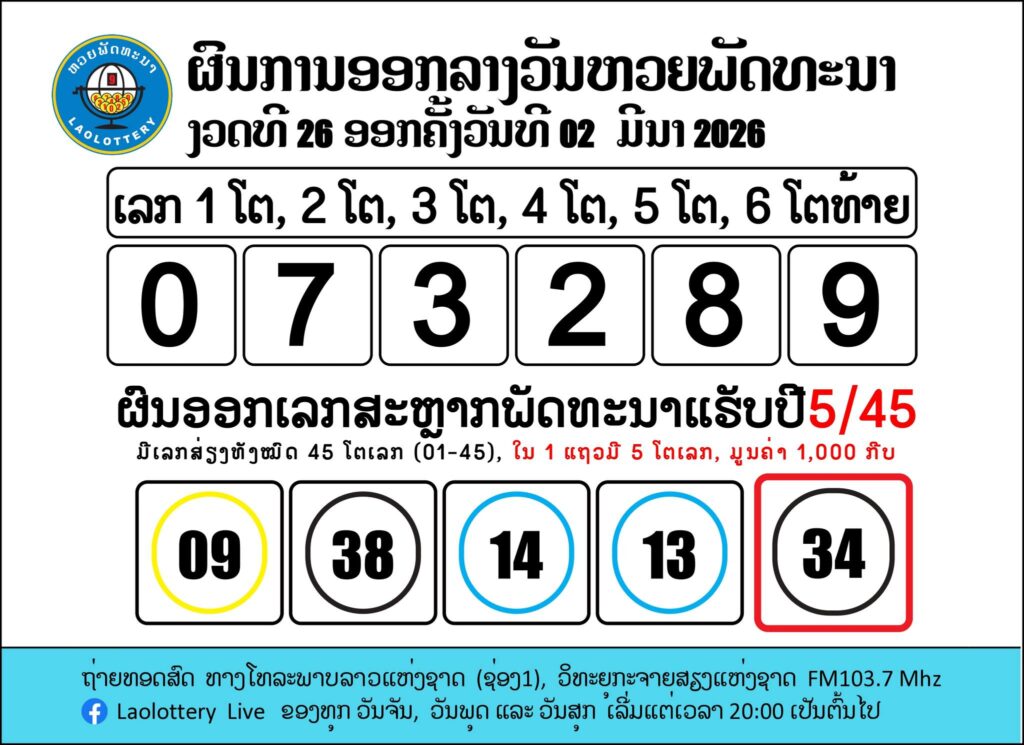 📌 ผลรางวัลหวยลาววันนี้ 2 มีนาคม 2569 (ลาวพัฒนา)
