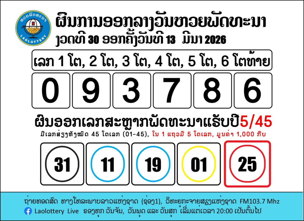 📌 ผลรางวัลหวยลาววันนี้ 13 มีนาคม 2569 (ลาวพัฒนา)