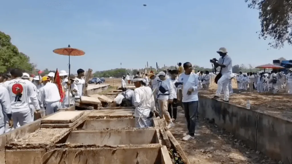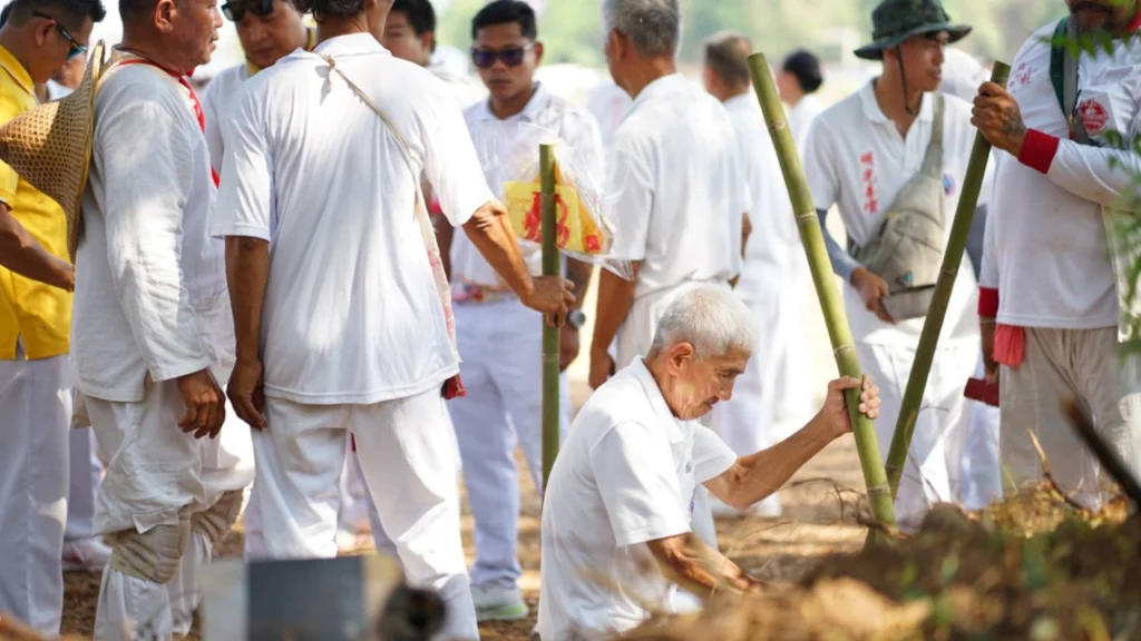 จุดที่สร้างความฮือฮามากที่สุดคือพิธีเปิดหลุมปฐมฤกษ์ ซึ่งมีเซียนสื่อประทับทรงร่วมประกอบพิธี ก่อนเปิด “หลุมที่ 39” เป็นหลุมแรกของวัน ท่ามกลางประชาชนที่สวมชุดขาวมาร่วมพิธีจำนวนมาก