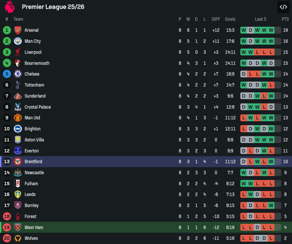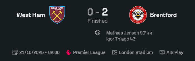 • คาดการณ์ประตู (xG): เวสต์แฮม 0.33 – เบรนท์ฟอร์ด 2.31