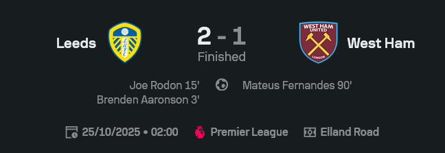 เกมนี้มันส์ตั้งแต่ต้น! ศึก พรีเมียร์ลีก คู่ระหว่าง ลีดส์ ยูไนเต็ด เปิดบ้านรับมือ เวสต์แฮม ยูไนเต็ด จบลงด้วยสกอร์ 2-1 จากสองประตูสุดเฉียบของ เบรนเดน อารอนสัน นาทีที่ 3 และ โจ โรดอน นาทีที่ 15 ก่อนที่ทีมเยือนจะมาไล่ตีตื้นช่วงท้ายเกมจากลูกยิงของ มาเตอุส เฟร์นันเดส นาทีที่ 90 แต่ไม่ทัน จบเกม ผลบอล สุดระทึก ลีดส์เก็บสามแต้มสำคัญในถิ่น เอลแลนด์ โร้ด ได้อย่างสุดมันส์