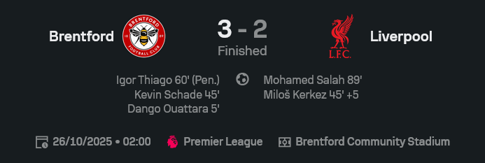 - เตะมุม: เบรนท์ฟอร์ด 5 | ลิเวอร์พูล 4