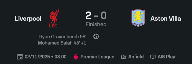 ลิเวอร์พูลภายใต้การคุมทีมของอารเน่อ สล็อต ยังโชว์ฟอร์ม วิเคราะห์บอล ระดับทีมลุ้นแชมป์ได้ชัดเจน แม้ วิลล่า จะพยายามเน้นเกมรับแน่นและสวนกลับ แต่การประสานงานของคู่กลางอย่าง กราเวนเบิร์ช กับ มัก อัลลิสเตอร์ ถือว่าเหนือกว่าอย่างเห็นได้ชัด เกมนี้แนวรุกเจ้าถิ่นคมและมีจังหวะเข้าทำต่อเนื่อง ต่างจากทีมเยือนที่แทบไม่มีโอกาสจบสกอร์จัง ๆ เลย เรียกได้ว่าหงส์แดงเล่นด้วยสมดุลทั้งรุกและรับ จบเกมคว้าชัยแบบสมราคา