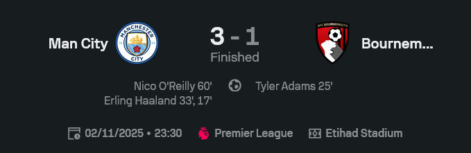 ค่ำคืนที่เอติฮัด สเตเดียม แมนเชสเตอร์ ซิตี้ กลับมาโชว์พลังเกมรุกสุดโหดอีกครั้งในศึก พรีเมียร์ลีก หลังเปิดบ้านอัด บอร์นมัธ ไปด้วยสกอร์ 3-1 โดยได้สองประตูจาก เออร์ลิ่ง ฮาแลนด์ ที่ยิงตั้งแต่ต้นเกมนาที 17 และ 33 ก่อนที่ นิโก้ โอ’ไรลีย์ จะซัดปิดกล่องในครึ่งหลัง ส่งเรือใบสีฟ้ากลับมารักษาเส้นทางลุ้นแชมป์ได้อย่างเข้มข้น ขณะที่ “เดอะเชอร์รี่ส์” ของอิราโอล่า พยายามยันเต็มที่แต่ต้านไม่ไหวในที่สุด เกมนี้สะท้อนศักยภาพระดับแชมป์ของทีมเป๊ปแบบเต็มๆ ผลบอล สุดท้ายจบที่ 3-1 สวยงามตามฟอร์ม