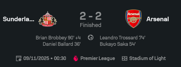 แฟน “เดอะ กันเนอร์ส” ถึงกับเซ็งกันทั้งบาง เมื่อ อาร์เซนอล ของ มิเกล อาร์เตต้า บุกไปโดน ซันเดอร์แลนด์ ยิงทดเจ็บแบ่งแต้ม 2-2 ในศึก พรีเมียร์ลีก อังกฤษ 2025/26 เกมนี้ “ปืนใหญ่” คุมเกมได้หมดทั้งสนาม แต่ดันมาโดน “แมวดำ” แทงสวนแบบเจ็บลึกในช่วงท้าย เรียกได้ว่าผล ผลบอลสด นี้เหมือนโดนตบหน้าให้ตื่นจากฝันแชมป์