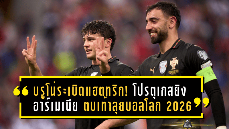 ค่ำคืนที่ เอสตาดิโอ โด ดราเกา กลายเป็นเวทีที่ บรูโน่ แฟร์นันด์ส กัปตันแมนเชสเตอร์ ยูไนเต็ด และจอมทัพทีมชาติโปรตุเกส ระเบิดฟอร์มสุดเดือด ซัด แฮตทริกแรกในสีเสื้อทีมชาติ พร้อมนำทัพ “เซเลเซา” ไล่ถล่มอาร์เมเนีย 9-1 จนการันตีการผ่านเข้ารอบ ฟุตบอลโลก 2026 แบบไม่ต้องลุ้นผลอื่น