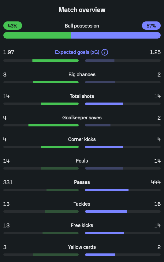 - ยิงทั้งหมด: เท่ากัน 14 ต่อ 14 เป๊ะ แต่ทีมเยือนเปลี่ยนโอกาสเป็นประตูได้ดีกว่า