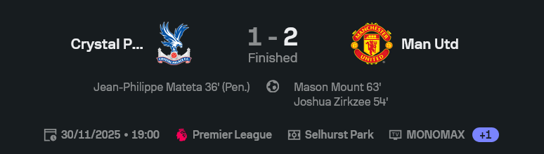 ฝั่งพาเลซต้องบอกว่าเสียดาย ฟอร์มโดยรวมไม่ได้ขี้เหร่ แผงกลางเก็บบอลได้ ยิงได้เยอะกว่าที่สกอร์บอก แต่ขาดคุณภาพจังหวะสุดท้าย แถมหลังโดนแซงเหมือนแรงฮึดหายไปหน่อย เกมแบบนี้ถ้าคมกว่านี้อีกนิด ผีแดงอาจกลับบ้านมือเปล่าก็ได้