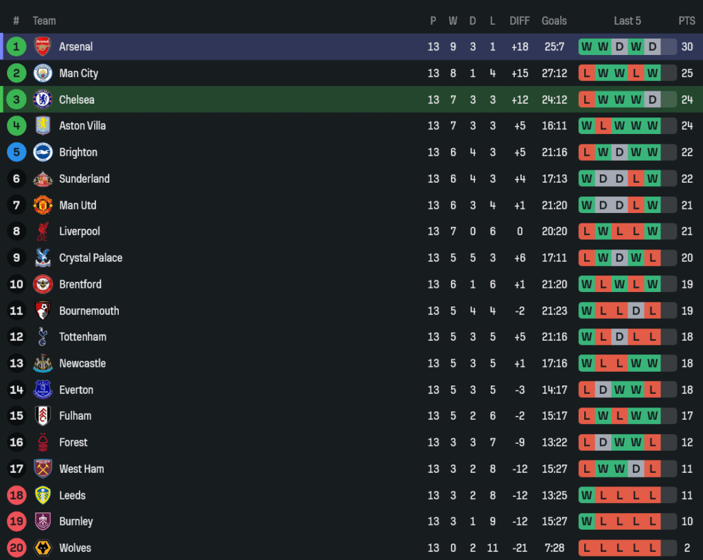- หลังจบเกมตารางคะแนน: อาร์เซนอลยังนำฝูงที่ 30 แต้ม เชลซีรั้งที่ 3 มี 24 แต้ม ไล่กดดันกลุ่มบนต่อเนื่อง