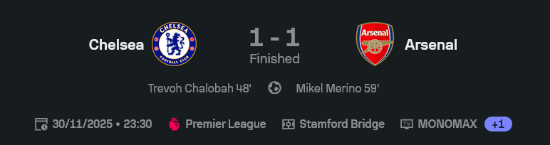 ลอนดอนดาร์บี้ที่สแตมฟอร์ดบริดจ์ดุเดือดสมชื่อ เชลซีเปิดบ้านรับอาร์เซนอลในศึก พรีเมียร์ลีก ซีซัน 2025/26 เกมนี้รูปเกมเหมือนจะเข้าทางปืนที่ครองบอลเหนือกว่า แต่สกอร์ในหน้า ผลบอลสด กลับวิ่งขึ้นลงให้ลุ้นกันทั้งคืน ก่อนจบที่ 1-1 แบ่งแต้มไปแบบมีทั้งคนยิ้มฝืนๆ และคนเซ็งจัด